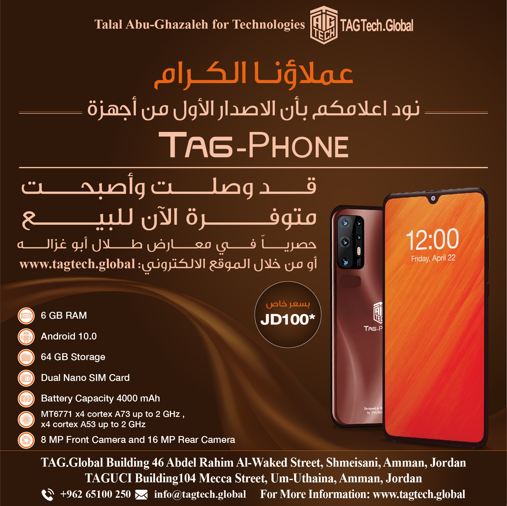TAG-Phone device is available in Jordan at JD 100 inclusive tax at TAG.Global showrooms or online order through TAGTech website, noting that it has a one-year warranty, and is available for free delivery to all governorates in the Kingdom.