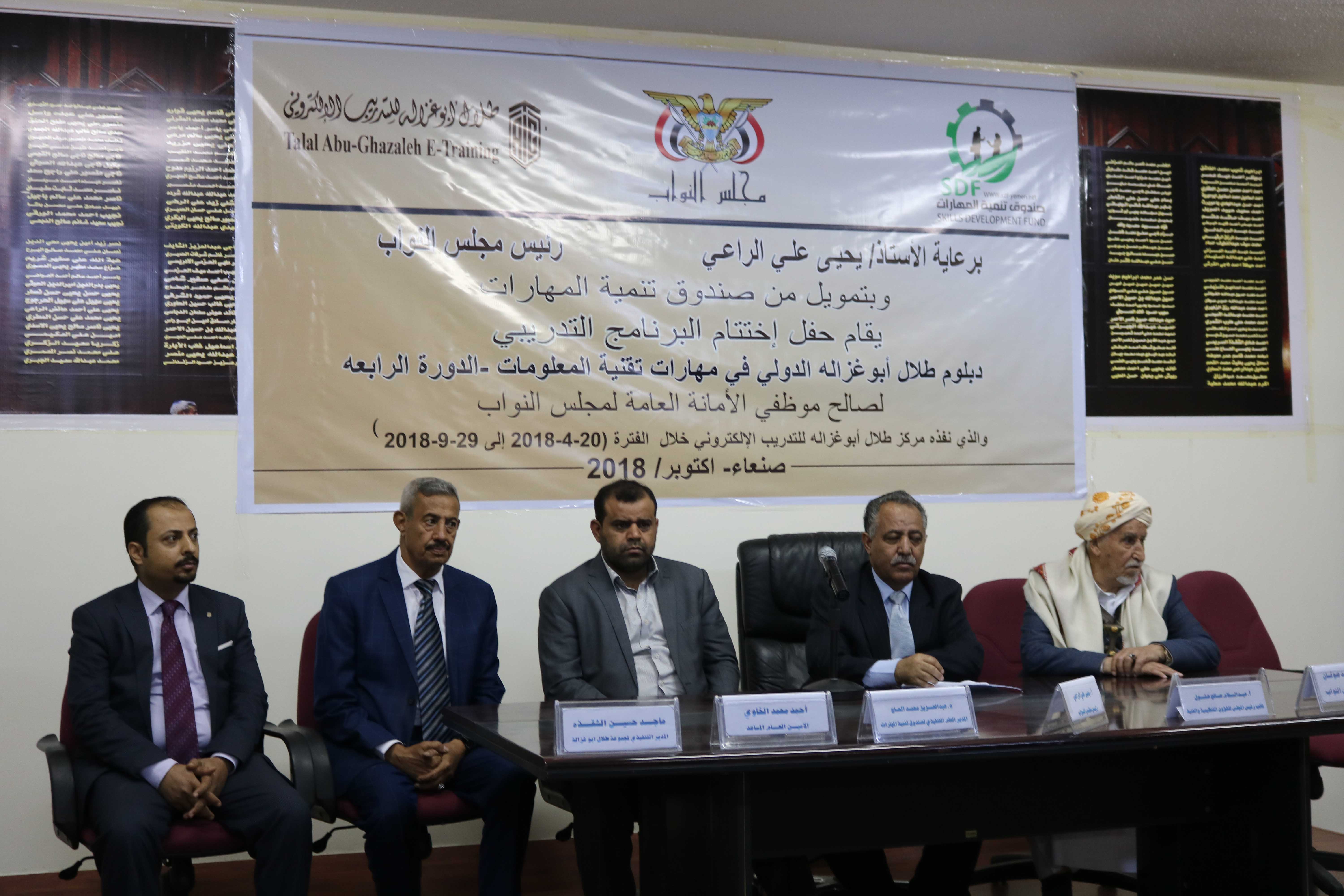 وجاء حفل الختام بحضور الأستاذ يحيى الراعي رئيس مجلس النواب، والاستاذ عبدالله أحمد صوفان الأمين العام، وأحمد محمد الخاوي الامين العام المساعد، ومحمد عبدالوهاب جغمان رئيس دائرة المعلومات والنظم، والدكتور عبدالعزيز محمد الحاج المدير العام التنفيذي لصندوق تنمية المهارات، والمهندس ماجد حسين الشقذة المدير التنفيذي لمجموعة طلال أبوغزاله/ مكتب اليمن.