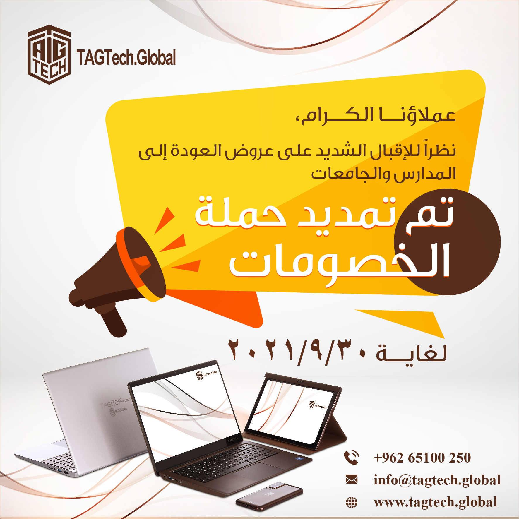 وبين نائب المدير العام للشركة الأستاذ رامز قنيبي أن تمديد حملة الخصومات جاء نظراً للإقبال الشديد على الشراء للمنتجات، وتحقيقا لمطالب العملاء بتقديم أفضل العروض لتعزيز ثقتهم في علامة "طلال أبوغزاله للتقنية- TAG-Tech" التجارية.