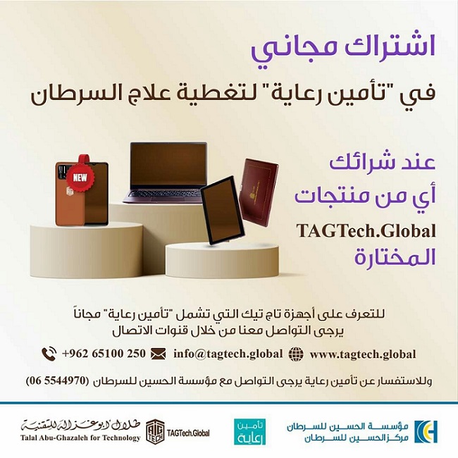 It should be noted that the King Hussein Cancer Foundation had previously signed a cooperation agreement with TAG.Global, with the aim of strengthening partnership and cooperation between the two parties in the areas of training, marketing, capacity building and exchange of expertise. A campaign to donate a certain percentage of the proceeds of the sales of devices produced by TAGTech was launched last year, for the benefit of disadvantaged patients at the Center.