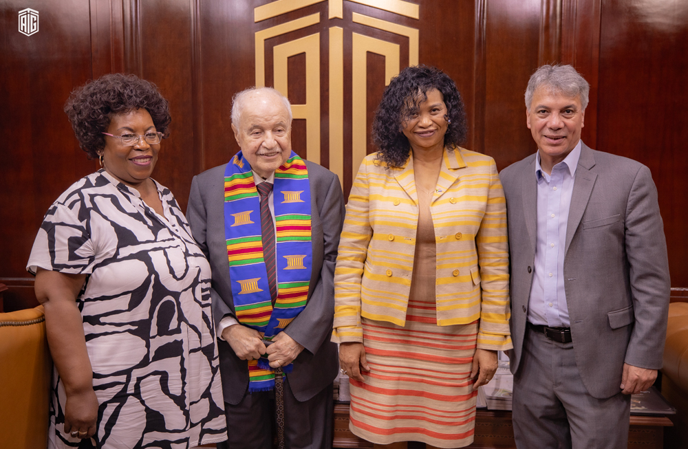 At the end of the meeting, Ambassador Mokuena presented Dr. Abu-Ghazaleh with the ‘Seat of the African King Kente Cloth Cotton Royal Chair Sash of the Republic of South Africa’ in recognition of his positions and the services he provides across various countries worldwide.