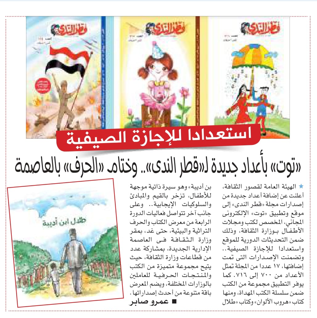 القاهرة – نشرت الهيئة العامة لقصور الثقافة المصرية التابعة لوزارة الثقافة في جمهورية مصر العربية قصة "طلال ابن أديبة"، عبر تطبيق "توت" الخاص بالأطفال لنشر القصص المصورة.