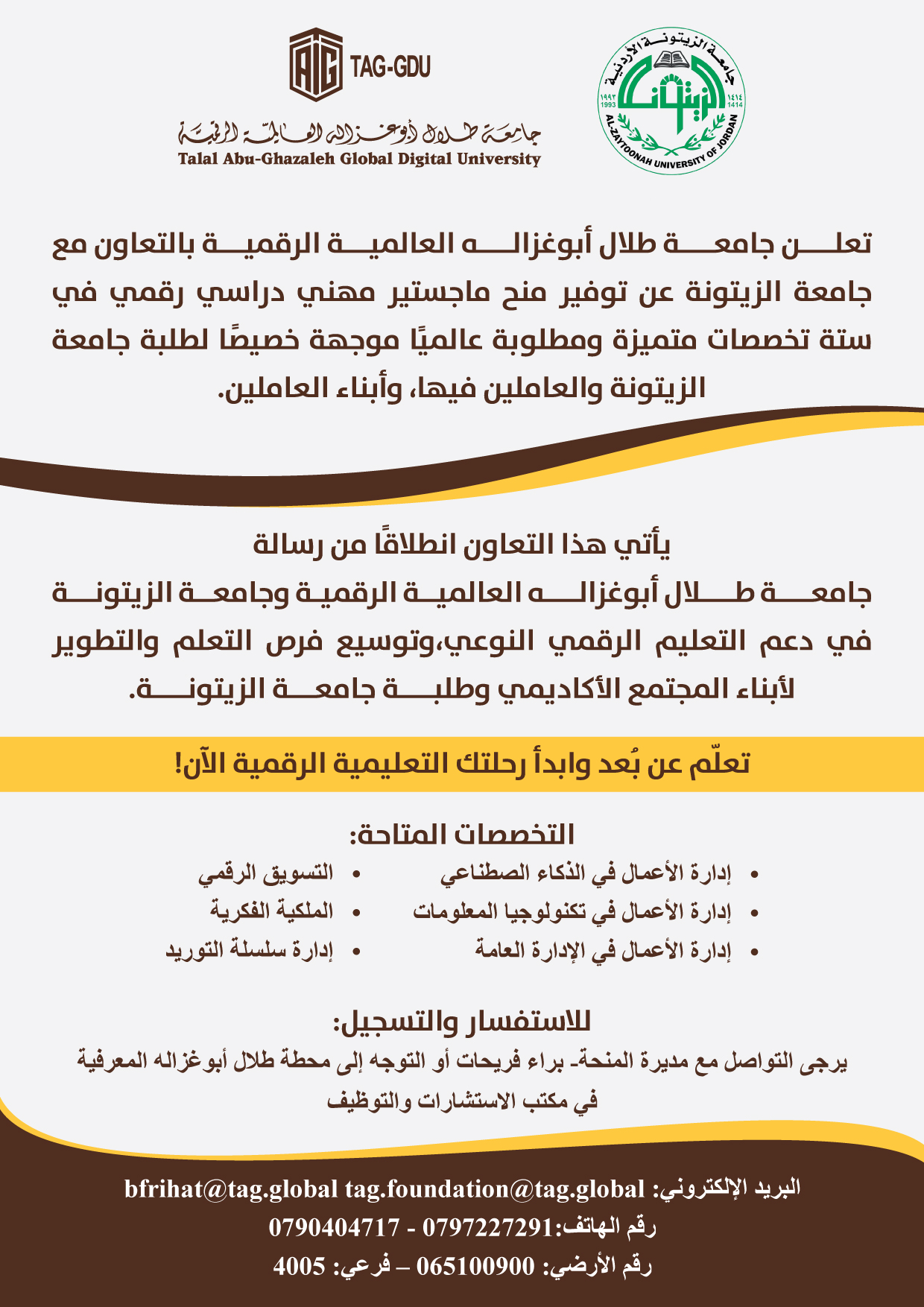 عمّان - أعلنت جامعة طلال أبوغزاله العالمية الرقمية (TAG-GDU)، إحدى مؤسسات طلال أبوغزاله العالمية الرقمية (TAG.GD)، وبالتعاون مع جامعة الزيتونة الأردنية، عن توفر منح دراسية لدرجة الماجستير المهني الرقمي في تخصصات متميزة ومطلوبة على مستوى العالم. وتُمنح هذه المنح حصريًا لطلبة جامعة الزيتونة، وأعضاء هيئتي التدريس والإداريين، وعائلاتهم.